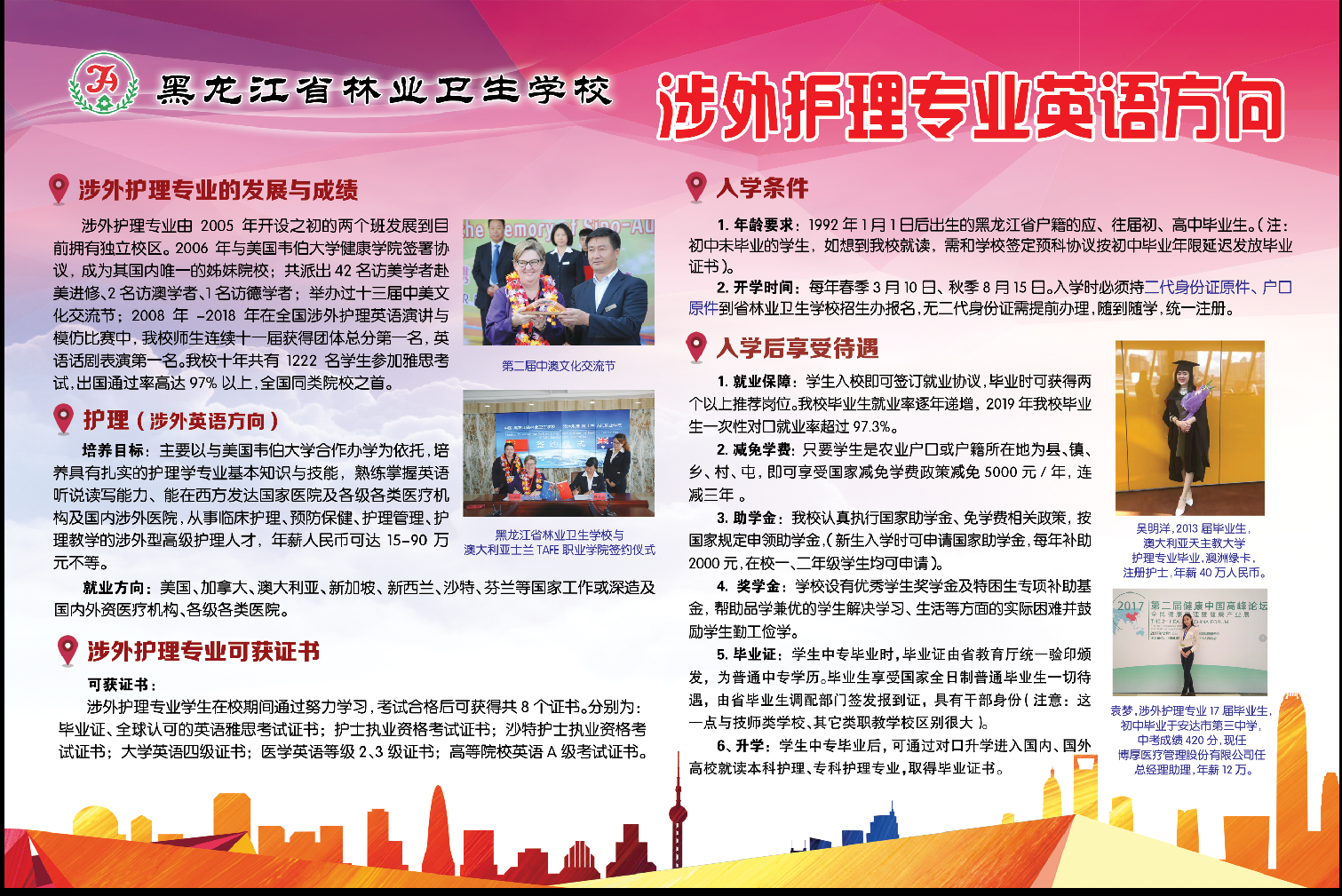 我校涉外05级涉外护理专业学生,雅思成绩6.5分,中考成绩300, 来自伊春地区的一个农村家庭,家境贫寒,但学习刻苦,2011年入读澳洲EQUALS TAFE学院。学习期间在当地一所养老院兼职工作,支付自己的学费和生活费,现已经顺利毕业拿到绿卡,并成为澳洲的登记护士,年薪约合35万人民币。